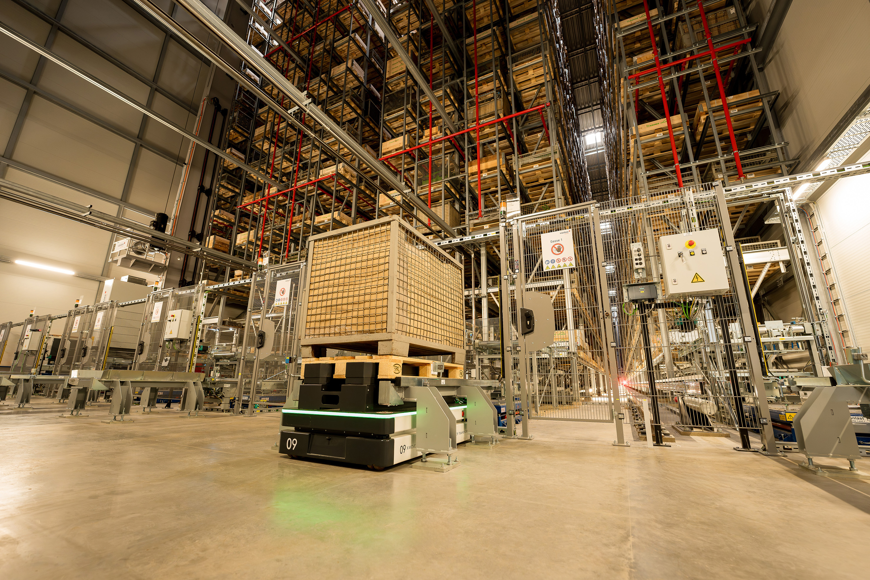 An innovative under pallet carrier system with ten autonomous transport units connects high-bay storage with the order picking areas, thereby optimising the internal flow of goods.