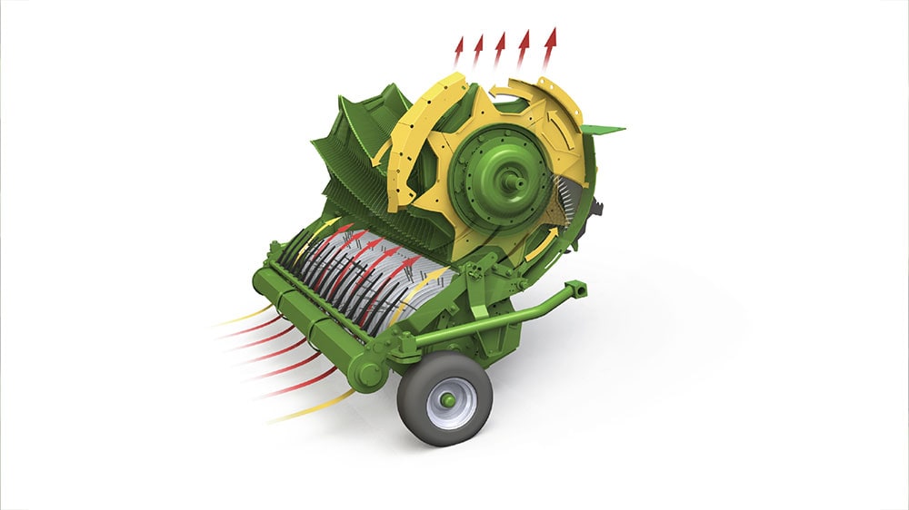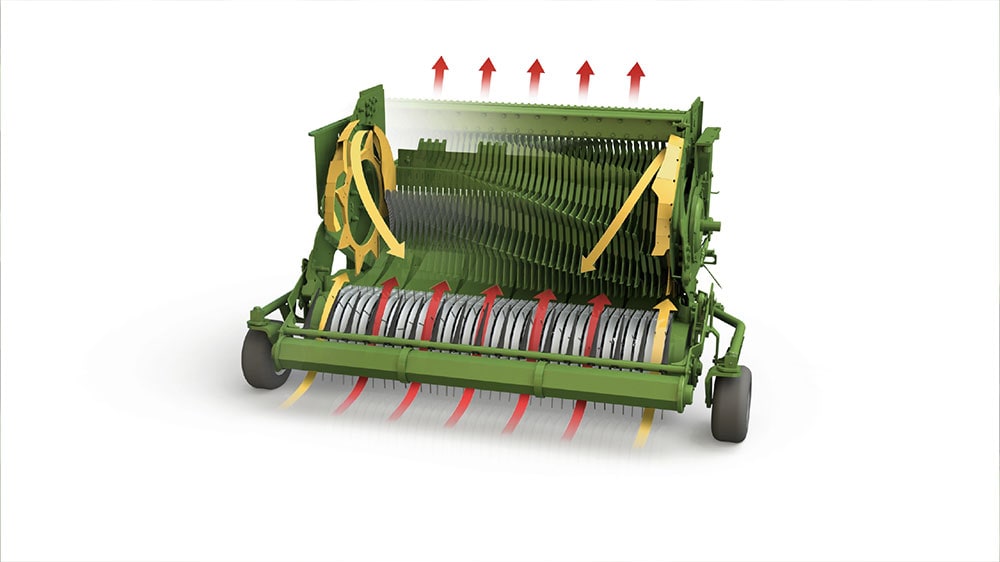 A brand-new innovation is the KRONE SplitCut – a system of two plates that are fitted between the outermost feeder stars and the body walls. These plates ensure that no uncut material flows over the rotor ends into the machine. The material flow is split as it passes the first knife and is fed over the tines back to the front where two deflector plates guide the crop to the middle of the rotor where it is cut and then fed into the machine.