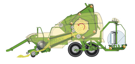 This is how the machine works: The crop collects inside the feed chamber while net wrapping is in progress. The feed chamber has one feed belt at the top and one at the bottom. The variable form of the feed chamber means it also serves as a pre-compression chamber. Pre-compression chamber, semi-variable baling chamber and tractor implement management system combine to provide swift working and high bale densities. Another new feature is the higher ground clearance of the baling chamber, which allows the bale to drop right on the wrapping table – another detail that speeds up the bale-wrap cycle.
