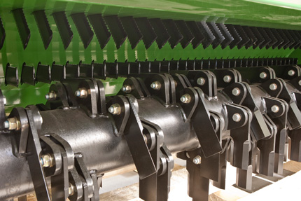 Further changes to the knives include more and heavier knives on the flail shaft, with the number of blades increasing from 72 to 88 and knives doubling their weight. As a result and as verified in multiple tests, these knives will not retreat from their working position – even when dealing with very heavy straw. As many as 94 opposite knives are mounted on two bars that are engaged without tools. The previously triangular knives on the second bar are now long and straight as well. The internal housing contours were modified to optimize the crop flow through the system. The minimum theoretical cutting length is 21mm. The so-called flail chopping principle eliminates the need to sharpen the knives daily.