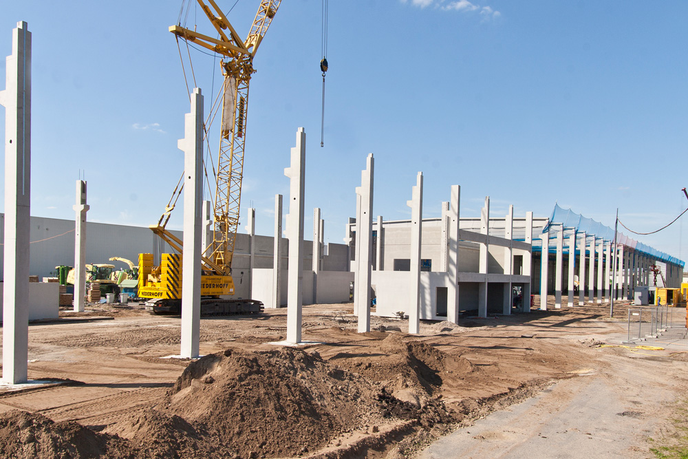 Spelle in July 2013. Construction work for the new production hall is in full swing at Krone's Spelle headquarters, where Big X production is scheduled to start on October 15. The new 265m by 27m building will feature the most innovative assembly lines and a high-shelf stockroom that meets a custom logistics concept as well as end-of-line test stands, where the finished machines will undergo extensive function checks.