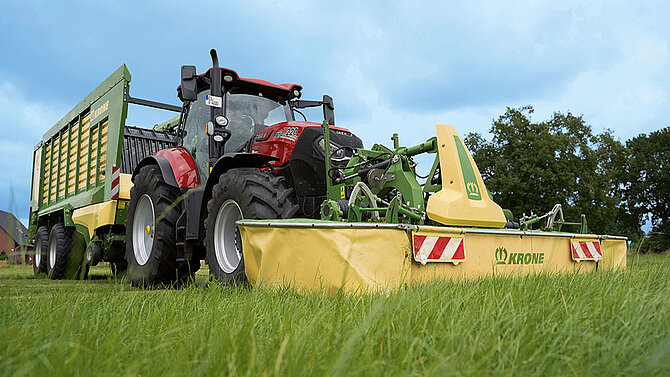 KRONE's innovative EasyCut F 400 Fold with merger auger sets new standards in forage harvesting. Depositing evenly formed swaths, the mower allows for efficient crop harvesting. A working width of more than four metres guarantees maximum efficiency – with a transport width of three metres made possible by the patented foldable cutterbar. Thus ensures excellent manoeuvrability for example when driving through cramped gates or unloading unto narrow forage tables.