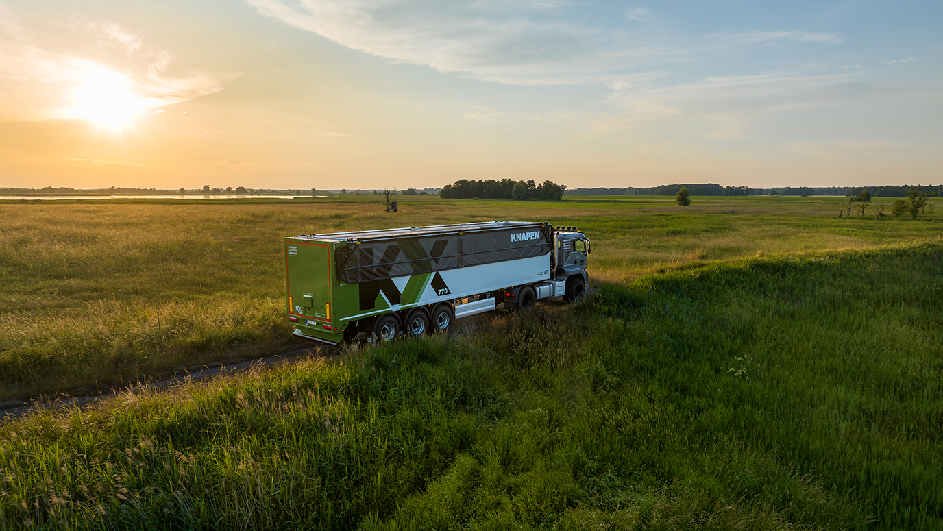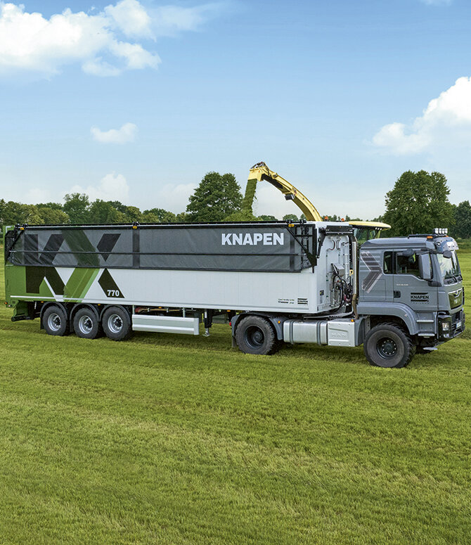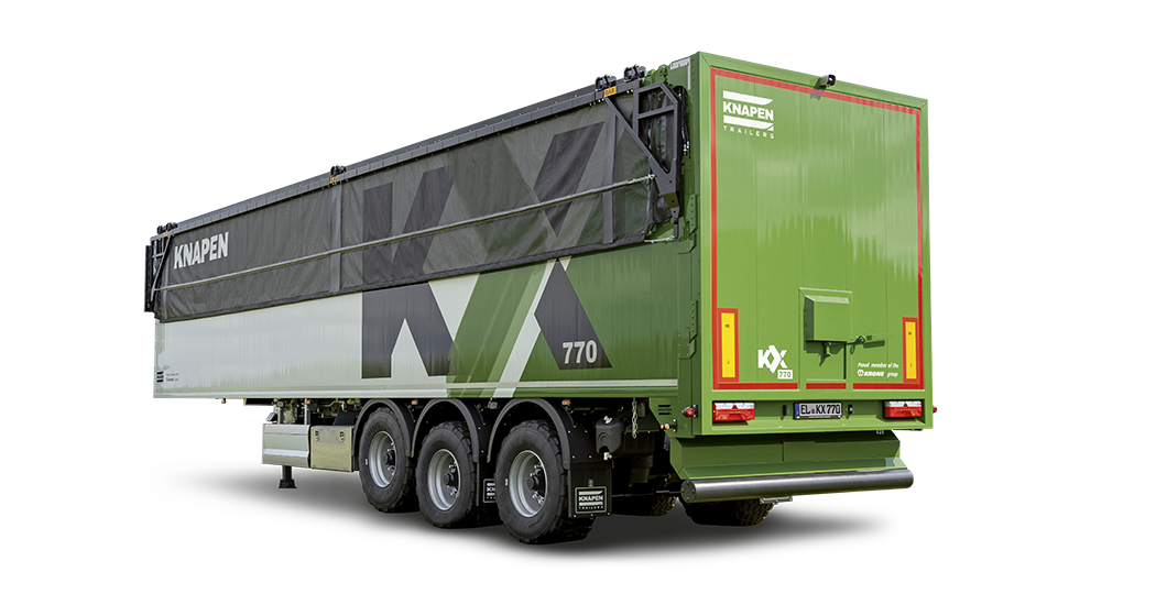 The Dutch company KNAPEN specialises in moving floor trailers and offers the KX series in cooperation with KRONE. This series comprises two moving floor trailers which have been specially designed for the agricultural sector. With load volumes of 65 m³ or 77 m³, they are the ideal companions for long transport distances. The Power Speed floor enables a fast unloading duration, thereby ensuring outstanding efficiency and power.