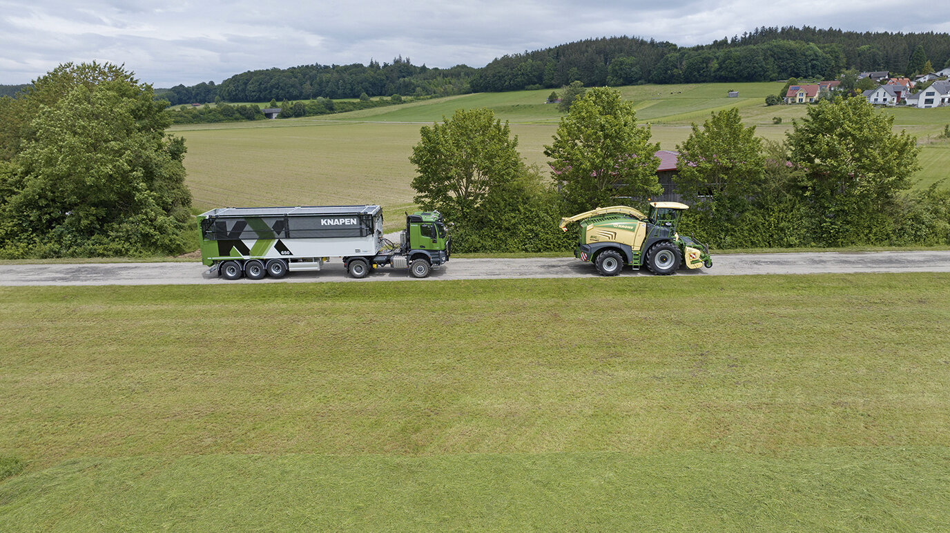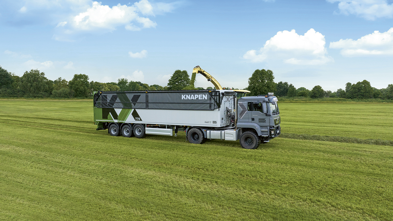 The KX series comprises two models, the KX 650 and the KX 770, with load volumes of up to 65 m³ and 77 m³ respectively, depending on the equipment. Especially for transport work over medium to long distances, the combination of agricultural truck and walking-floor trailer proves to be extremely interesting from an economic and labour-economical point of view. Together with the subsidiary Knapen Trailers, which has been part of the KRONE Group since 2019, the company is expanding its product portfolio: In addition to the KRONE TX and GX agricultural transport professionals, Knapen is now launching the KX walking floor trailer.