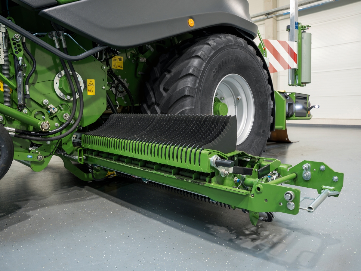 The bearing pressure of the crop press roller unit and pick-up can easily be set via the tension springs. The tool-free chain adjustment means that the working height of the crop press roller unit can be adapted quickly and easily to achieve maximum performance.