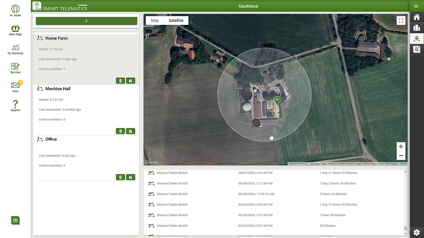 • NEW: With GeoFence, it is determined when a machine enters or leaves a defined area.