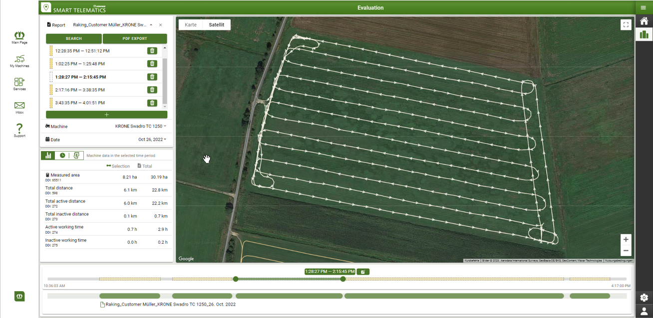 With KRONE Smart Telematics, you can analyze the recorded machine data in real time or retrospectively. Data transmission is automatic and enables precise documentation of working times and area performance without manual input.