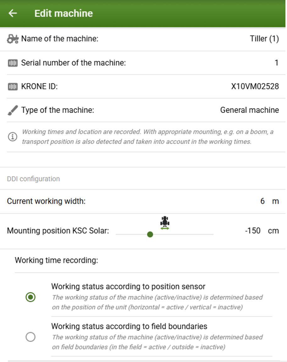 Working widths can be stored for third-party machines that are created as the "General machine" type. The corresponding type and working width are automatically stored for KRONE machines.