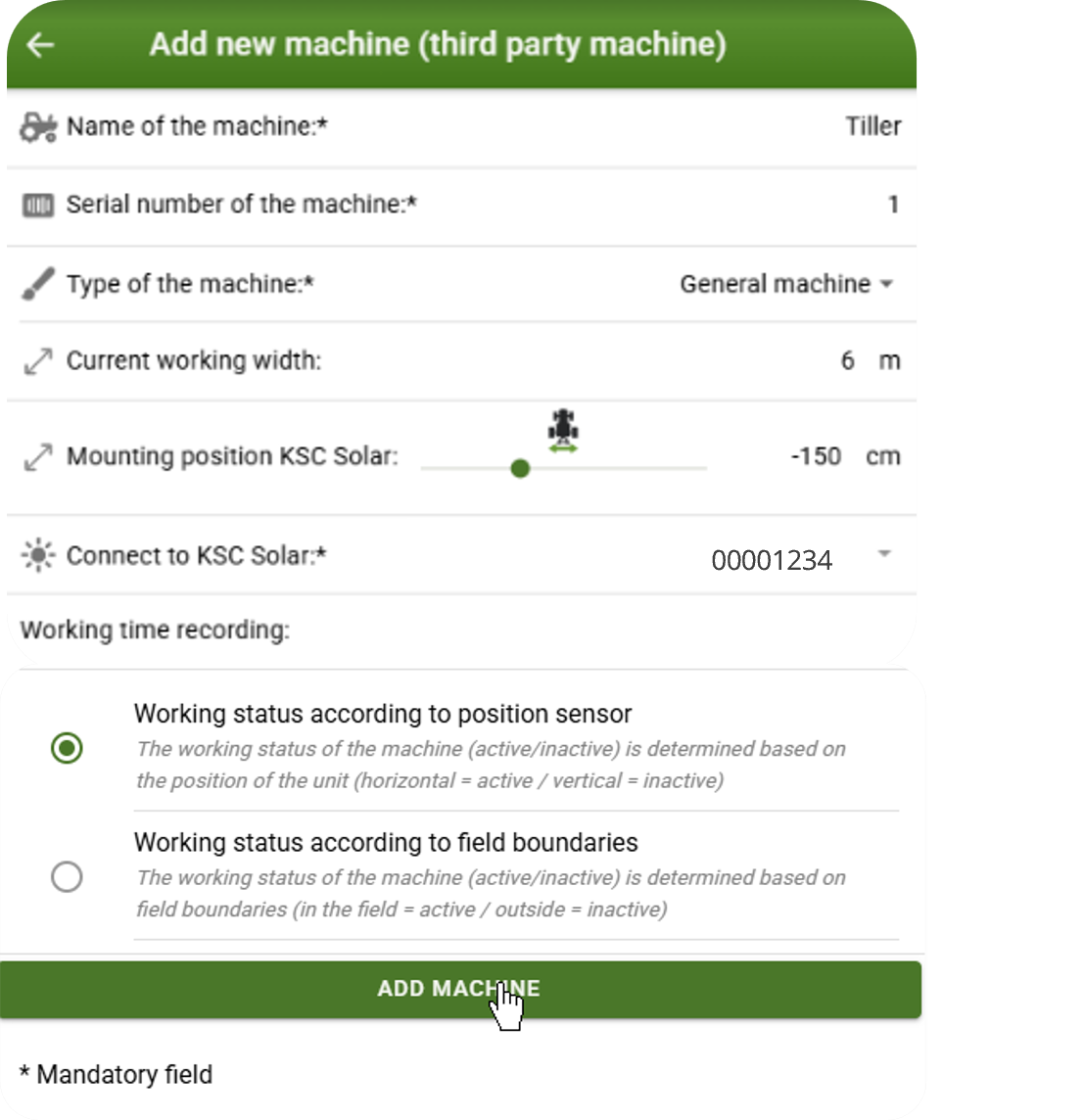 6) For third-party machines: Select name, serial number, type,  working width and mounting position